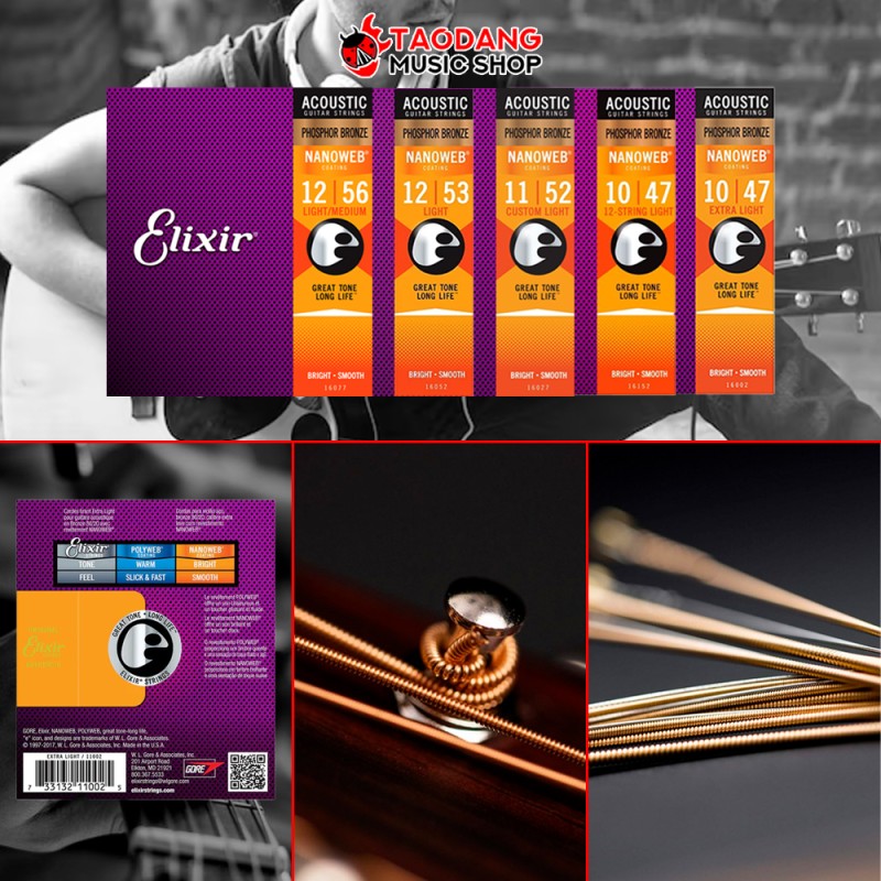 Elixir® Strings Acoustic Phosphor Bronze with NANOWEB® Coating deliver distinctive phosphor bronze warmth and sparkle together with extended tone life.