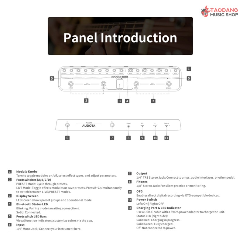 - Noise Gate, Boost, Modulation, Delay, Reverb